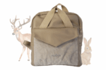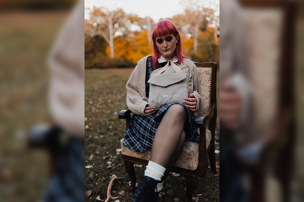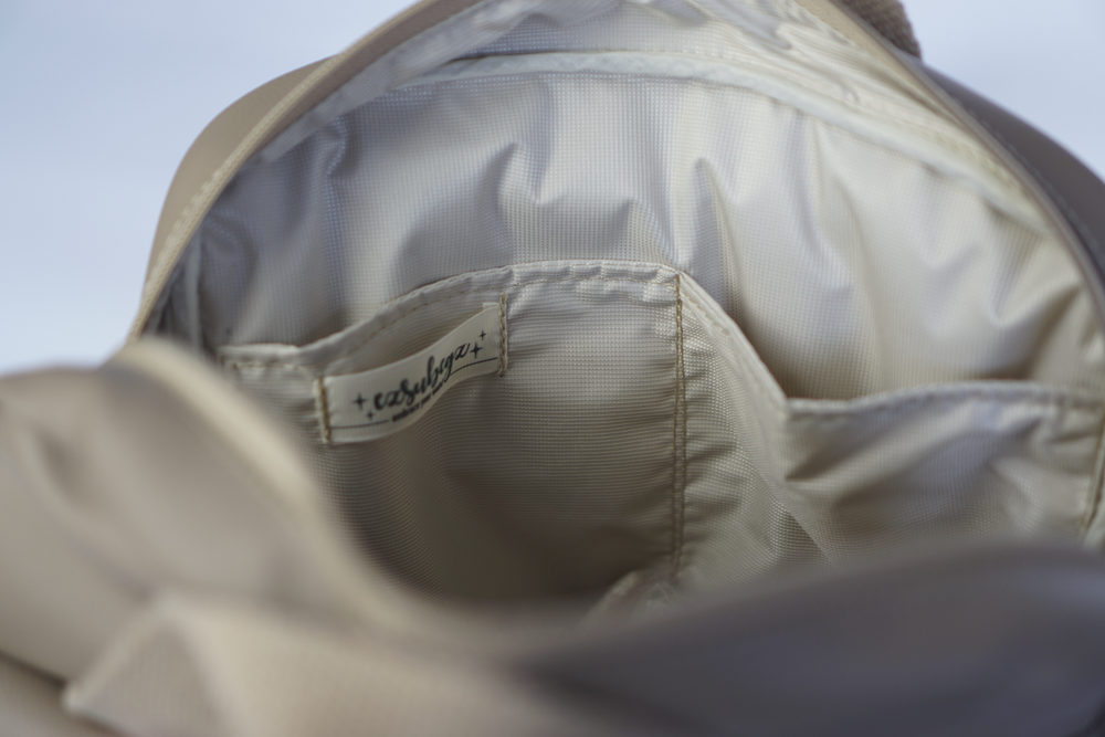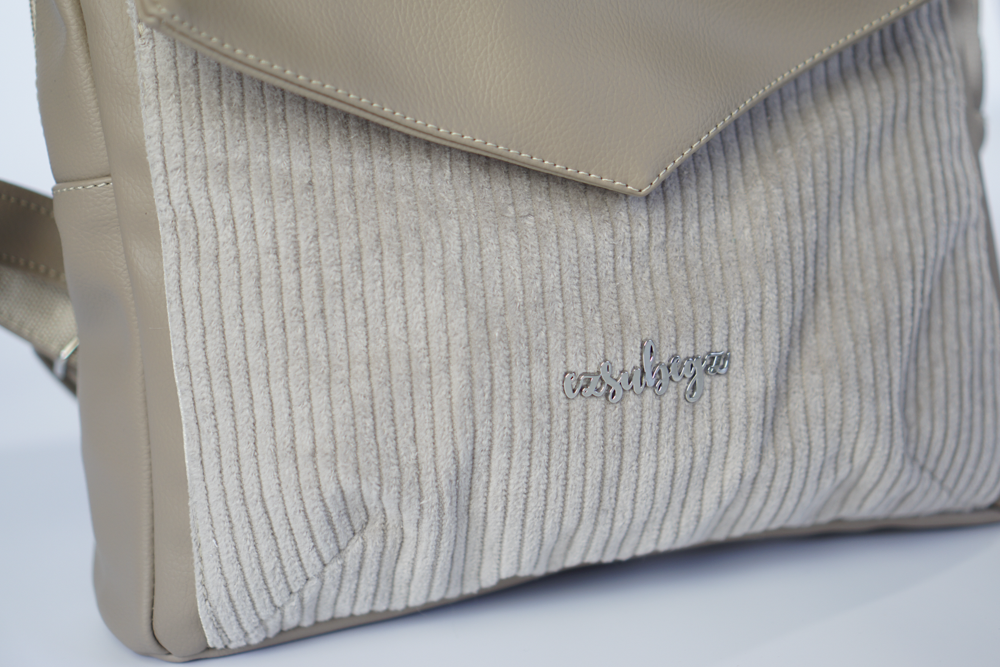 A hátizsák elején lévő zseb kordbársony, mely fedéllel záródik